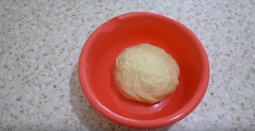 4. Далее замешиваем тесто в течение 10-15 минут на столе, присыпанным мукой, до тех пор пока оно не перестанет липнуть. Готовое тесто кладем в миску, смазанную растительным маслом, накрываем сухим полотенцем и убираем в теплое место на час- полтора, пока оно не увеличится в объеме в 2-3 раза.