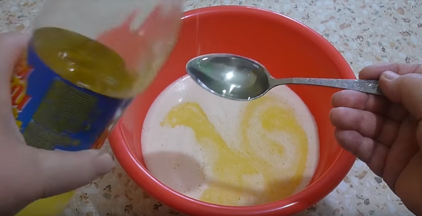 Соединяем вместе содержимое обеих мисок (с яйцами и с молоком), добавляем к ним растительное масло и еще раз перемешиваем.