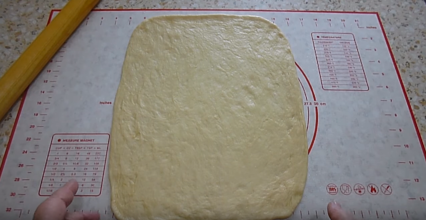 Раскатываем тесто до прямоугольной формы толщиной в 3-4 мм. Скалку перед этим тоже нужно смазать растительным маслом.