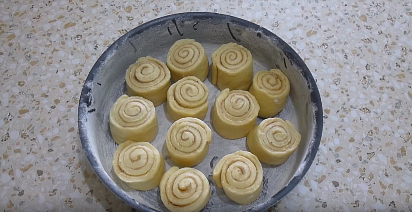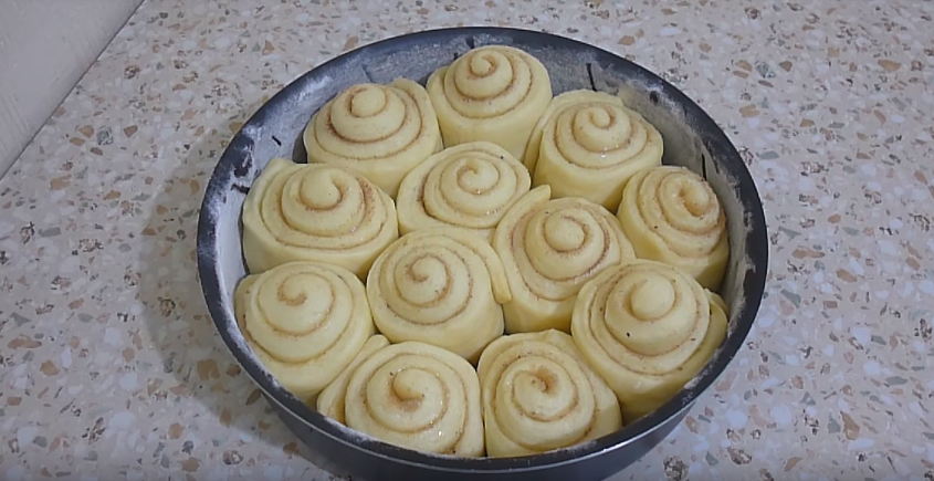 Заготовки укладываем не плотно, так как их нужно накрыть полотенцем и оставить на «расстойку» на 30 минут. За это время они увеличатся в объеме и как раз заполнят форму.