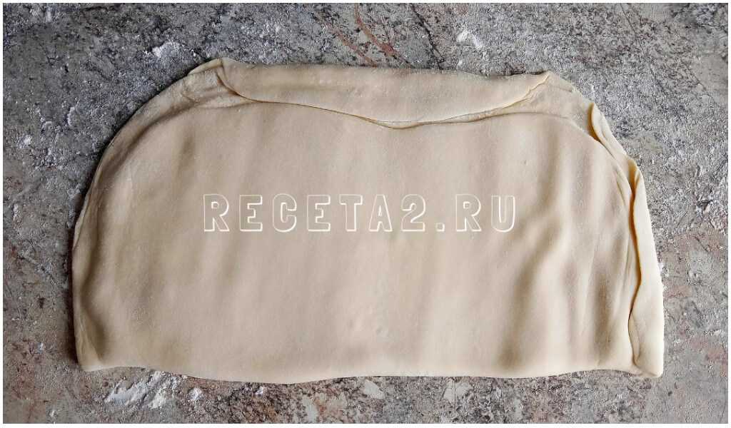 5. Разворачиваем конверт на 90 градусов и начинаем его как бы расплющивать скалкой в длинную прямоугольную ленту. Снова убираем излишки муки и складываем ассиметрично в 4 слоя тесто.
