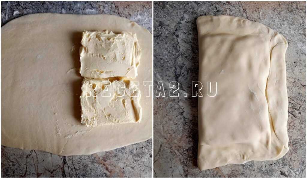 - Тестовую массу раскатать в пласт, по центру разложить треть масляных пластинок, сложить конвертом, защипнуть края.