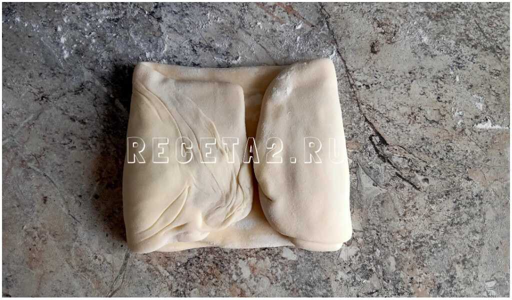 Как заворачивать слоеное тесто Теперь делаем первое складывание: мысленно разделите прямоугольник теста поперёк на три одинаковые доли, правый край сложите на центральную часть, смахните лишнюю муку с новой поверхности и положите на нее левый край. Мы получили первые три слоя. Теперь поверхность можно припылить мукой, положить тесто на пергамент и убрать в холодильник, обернув предварительно в пленку и на 30—45 минут.