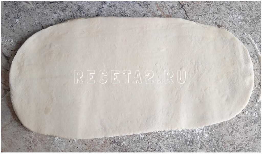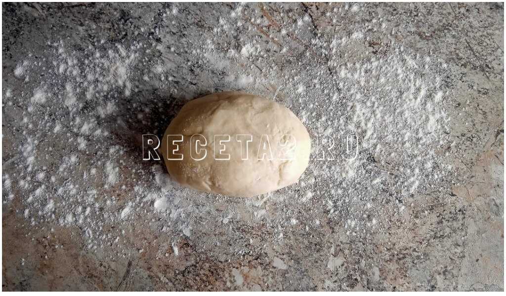 3. Присыпаем стол мукой, кругляшу придаем немного вытянутую форму, чтобы при раскатывании получался прямоугольник.