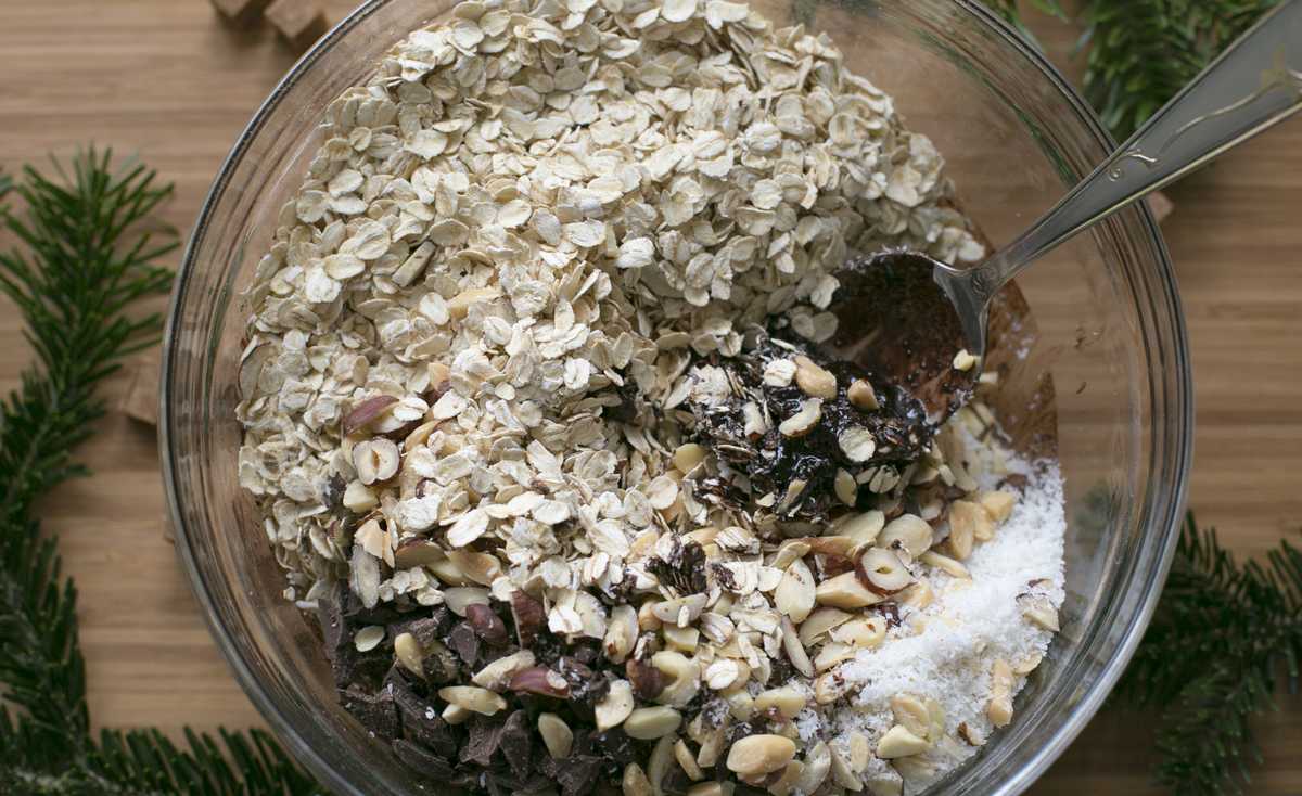 - В миске смешайте овсяные хлопья, кокосовые хлопья и орешки или семечки.