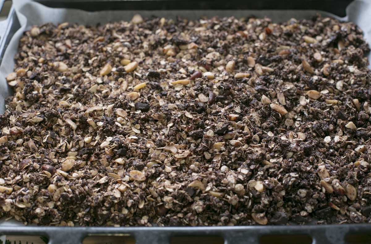 - Выложите злаковую смесь на противень тонким слоем и поставьте в духовку. Запекайте 30—40 минут, помешивая каждые 10 минут. Если у вас маленькие противни, то лучше взять два или выпекать гранолу частями, иначе она будет очень медленно пропекаться.