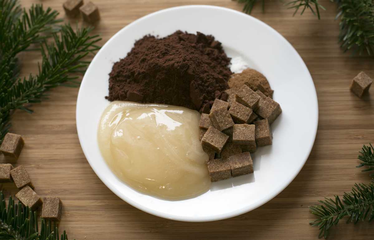 Отмеряем 3 ст.л натурального мёда, 3 ст.л коричневого сахара и 4 ст.л темного какао порошка.