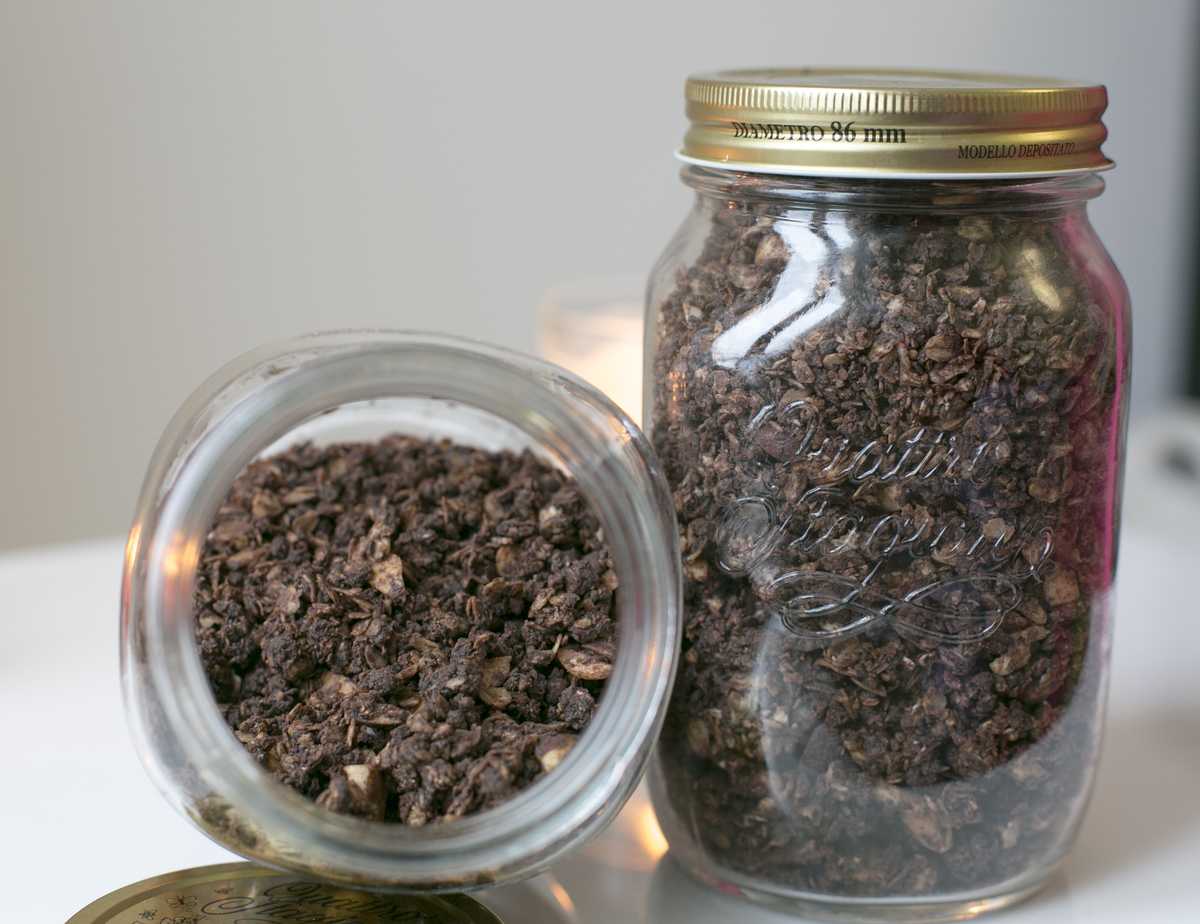 Когда гранола приготовилась, я очень расстроилась — ведь она сильно блестела от масла и расплавленного шоколада. Я дала ей остыть в противне около полу часа. Потом переложила в стеклянную миску, слегка прикрыла крышкой и оставила на сутки отстояться. В конечном счете результат очень порадовал. Гранола стала матовая, сухая и хрустящая с умопомрачительным ароматом, поглощающий все и всех вокруг себя. Рецепт действительно замечательный, всем советую попробовать. Впервые я приготовила шоколадную гранолу как часть подарка любимому мужу, что бы сделать его завтраки более разнообразными.