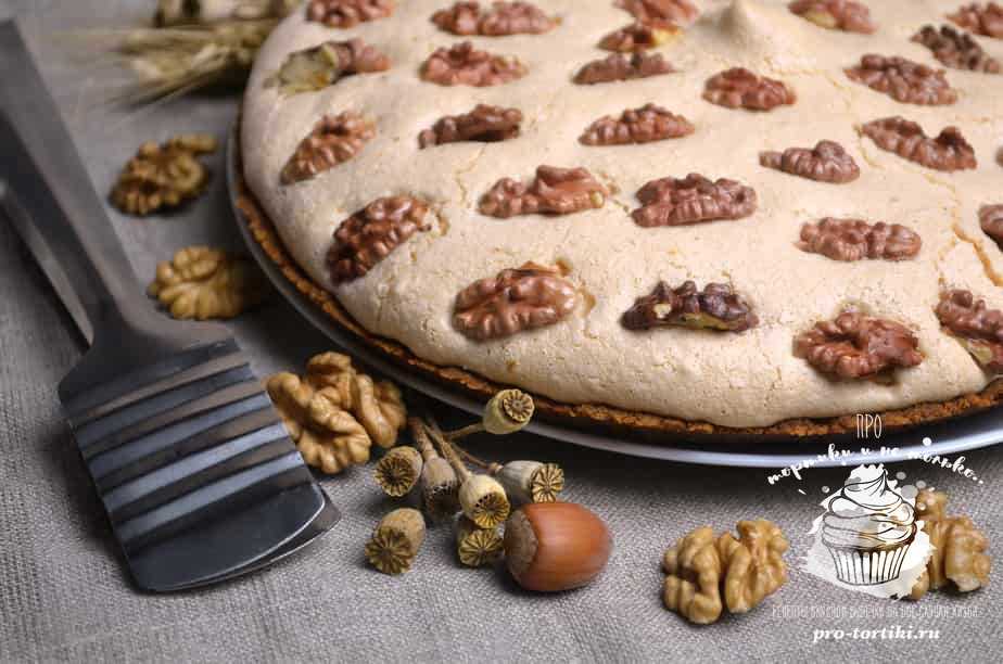 8. Ядра грецких орехов делят на половинки или на четверти, раскладывают симметрично на поверхности белкового слоя. Вдавливать орехи не нужно.