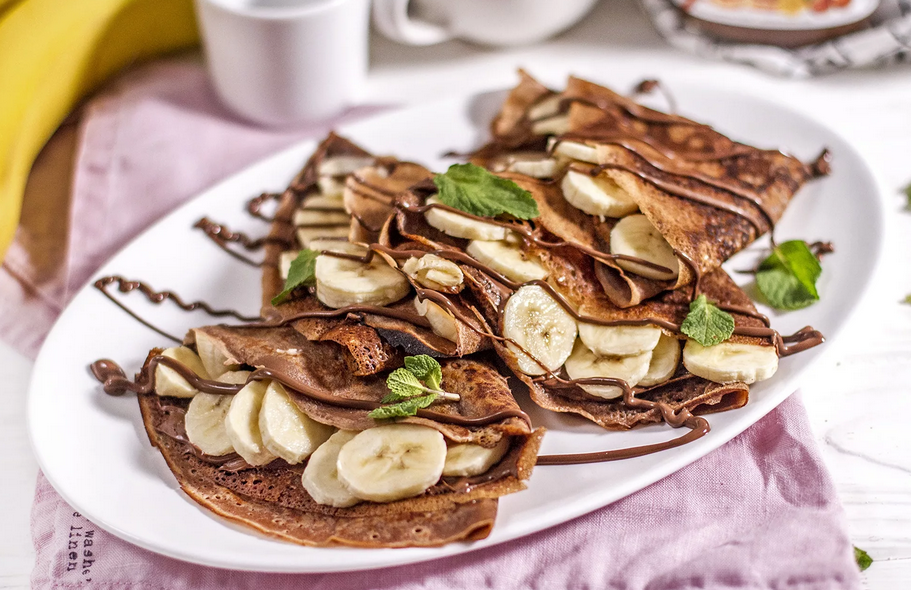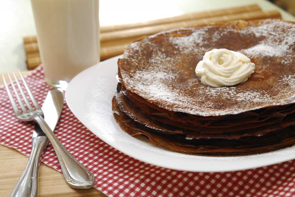 Подают на стол шоколадные блинчики с горячим какао, зеленым чаем, сметаной, творогом.