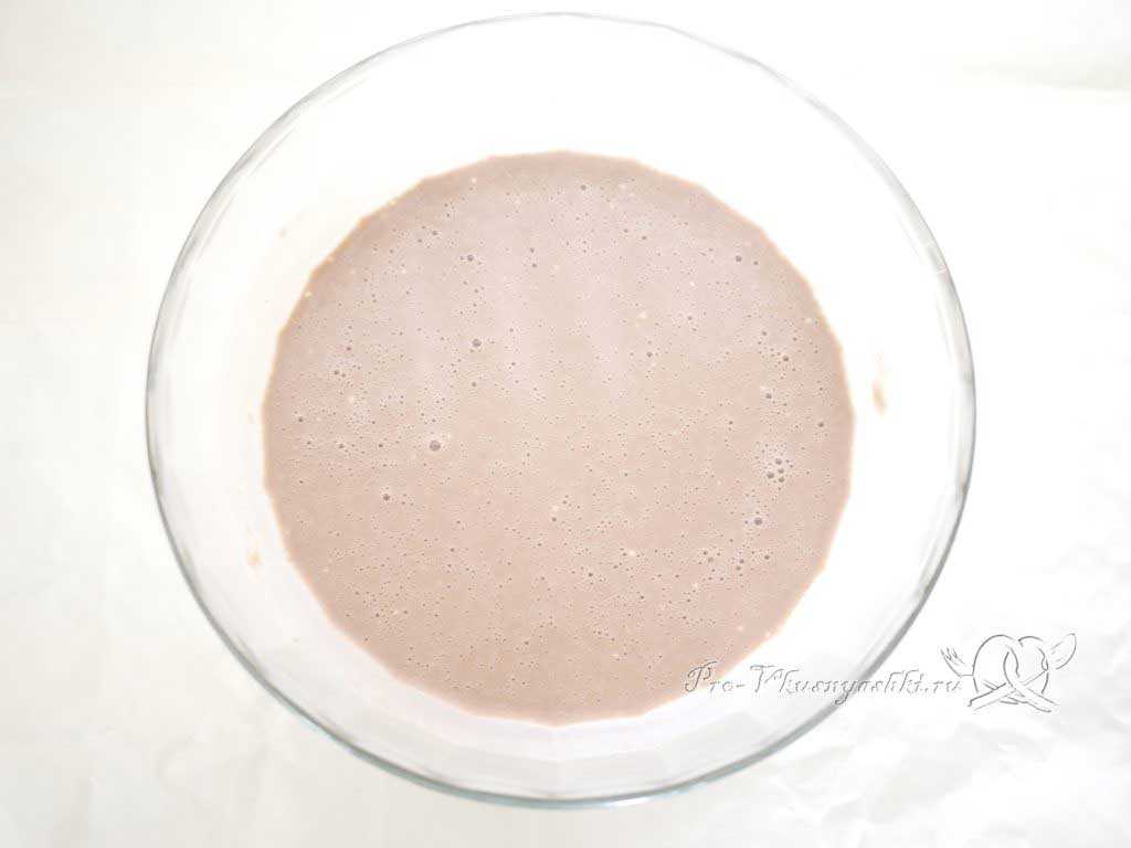 Тесто должно быть пастельно-шоколадного цвета, воздушное, с множеством пузырьков и очень жидкое.