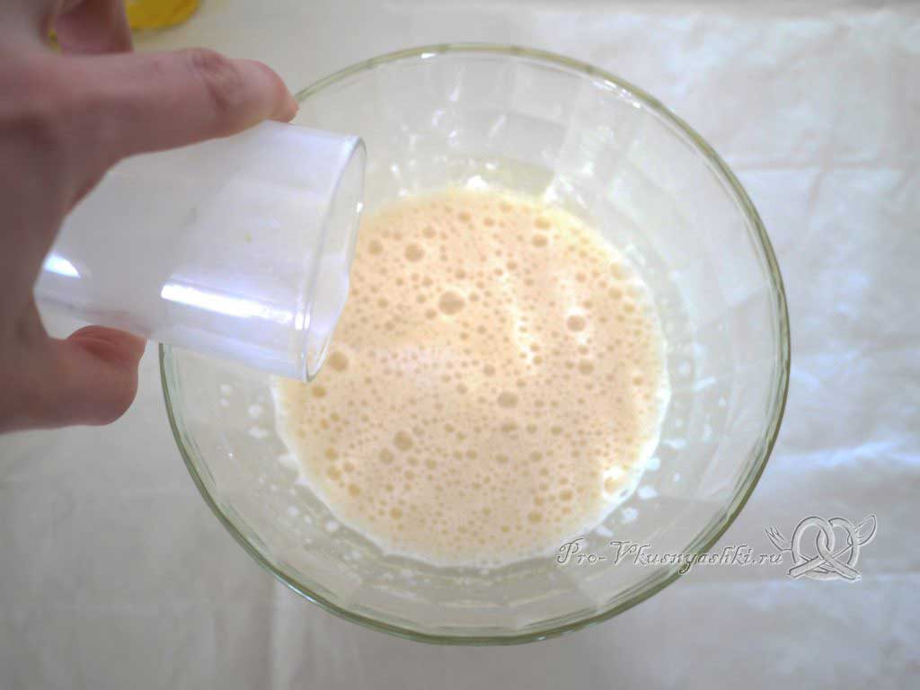- В яичную болтушку вольем молочко, повторим быстрое перемешивание.