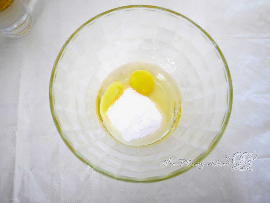 В миску вбиваем яйца (2 шт), добавляем соль (1 ч.л) и сахар (3 ст.л), взбиваем продукты с помощью венчика или миксера до растворения сыпучих ингредиентов.