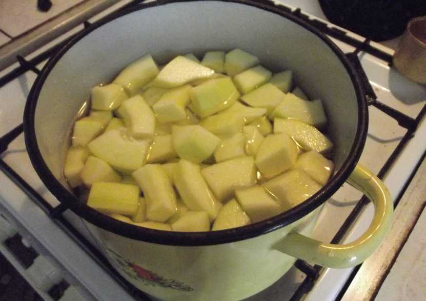 - В другую кастрюлю вылить 2 стакана воды, положить туда яблоки и варить на 1/3 огня от мощности плиты 5 минут.