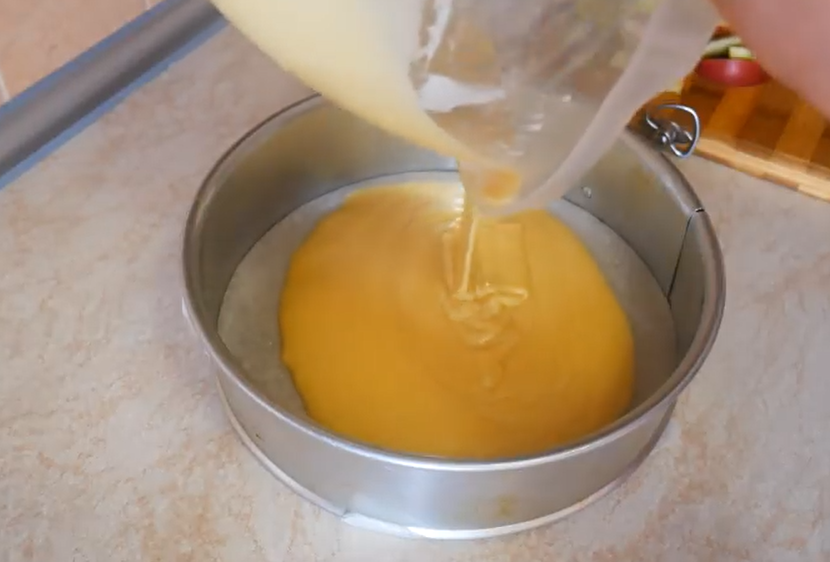 5. Полученную яично-мучную смесь заливаем поверх фруктовых долек и отправляем в духовой шкаф при температуре 200 градусов на 40 минут.