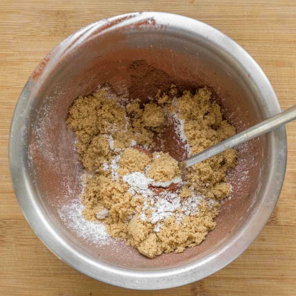 5. В отдельную миску просеиваем какао (16 гр), муку (13 гр) и разрыхлитель (1/5 ч.л.), добавляем мелкий коричневый сахар (72 гр.) — если сахар крупный, лучше измельчи его в кофемолке, или измельчителе, иначе он будет хрустеть на зубах.