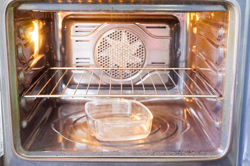 12. На дно духовки ставим жаростойкую посудину с кипятком, а сам чизкейк — на полочку по середине.