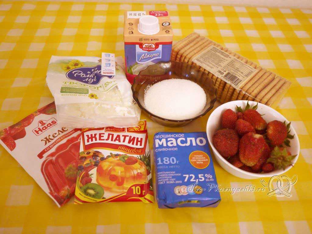 Подготовим ингредиенты. Главным компонентом коржа — основы чизкейка следует выбрать свежее сахарное печенье, такое как «к кофе» или «с топленым молоком». У меня сегодня второй вариант. Свежую клубнику хорошо промываем под проточной водой и избавляем от плодоножки. Жирные сливки для взбивания убираем в морозилку.