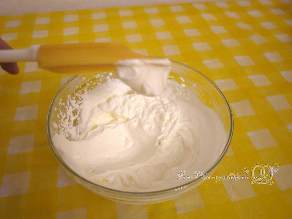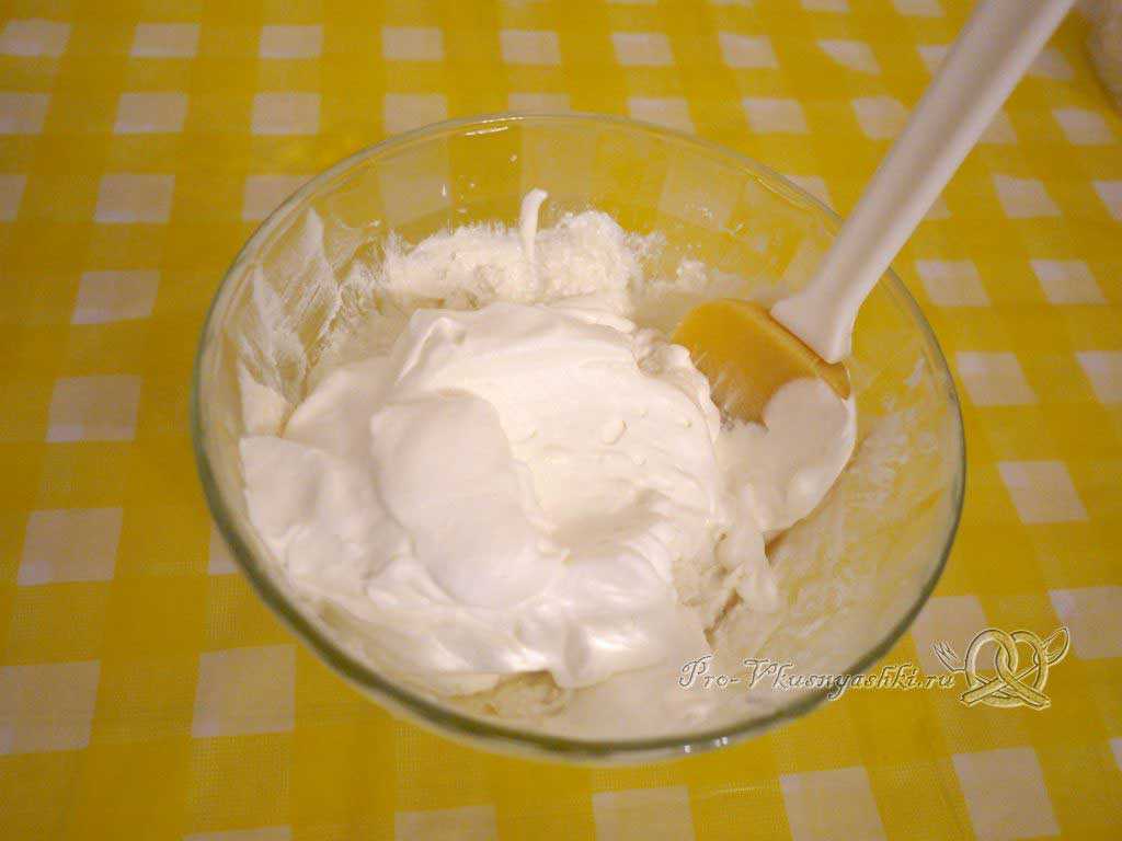 Соединяем взбитые сливки с творожной массой с помощью лопатки.
