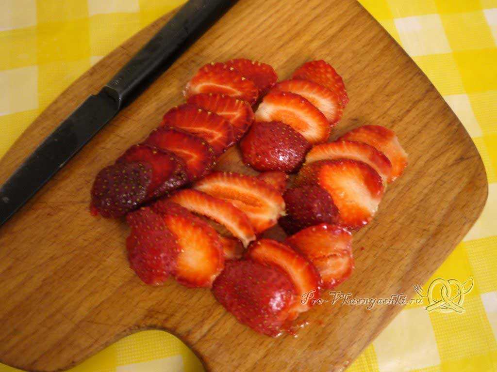 Для приготовления самого верхнего слоя — клубничного желе я использовала покупной полуфабрикат, но Вы можете приготовить его самостоятельно, взяв 50 г ягод, 10 г сахара, 1 ч.л желатина, 80 мл кипятка и 20 мл холодной воды. Ягоды следует залить кипятком, потом необходимо добавить к ним сахар и перемолоть все в пюре. Желатин нужно замочить в холодной воде до набухания, затем распустить и добавить в клубничную смесь, перемешать. Вот и все, наше желе готово, можно использовать его по назначению в рецепте.