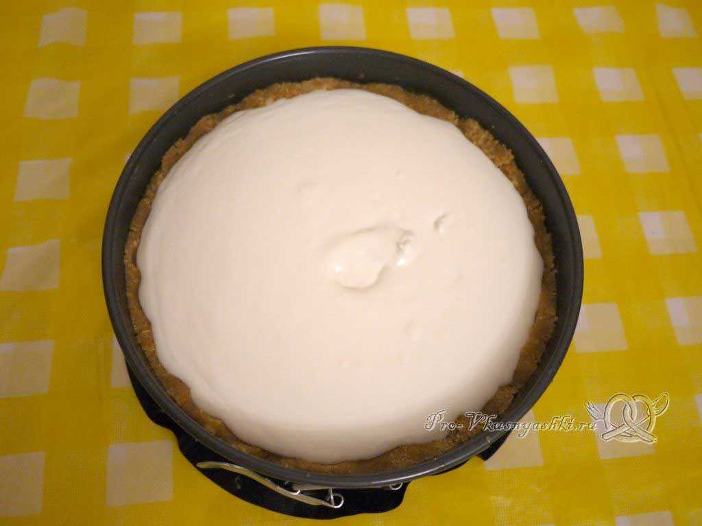 Форму достаем из холода и выливаем в нее крем. Убираем чизкейк в морозилку примерно на 5-10 мин, до того времени, пока не схватится его поверхность, чтобы выложить на нее фрукты.