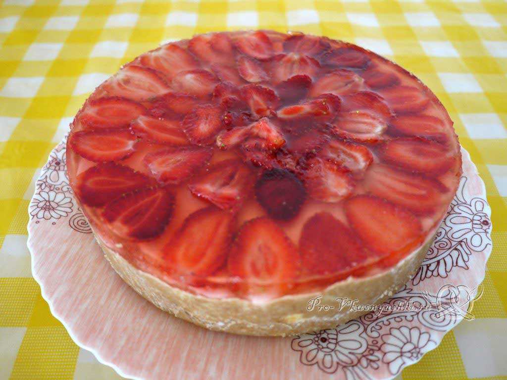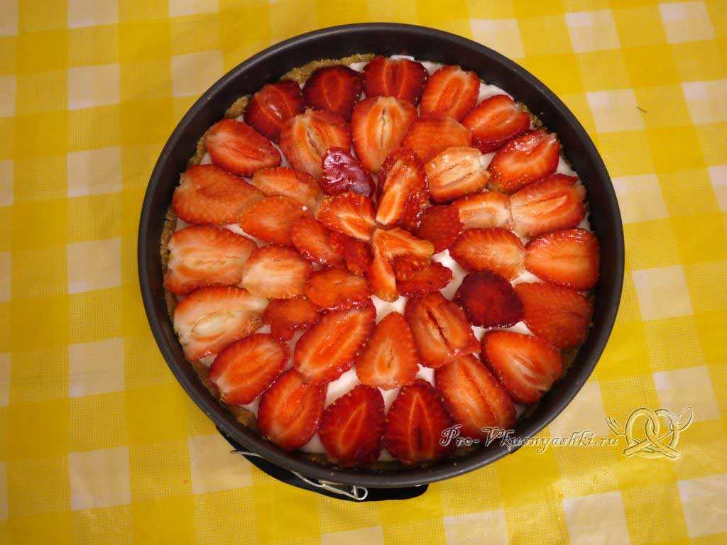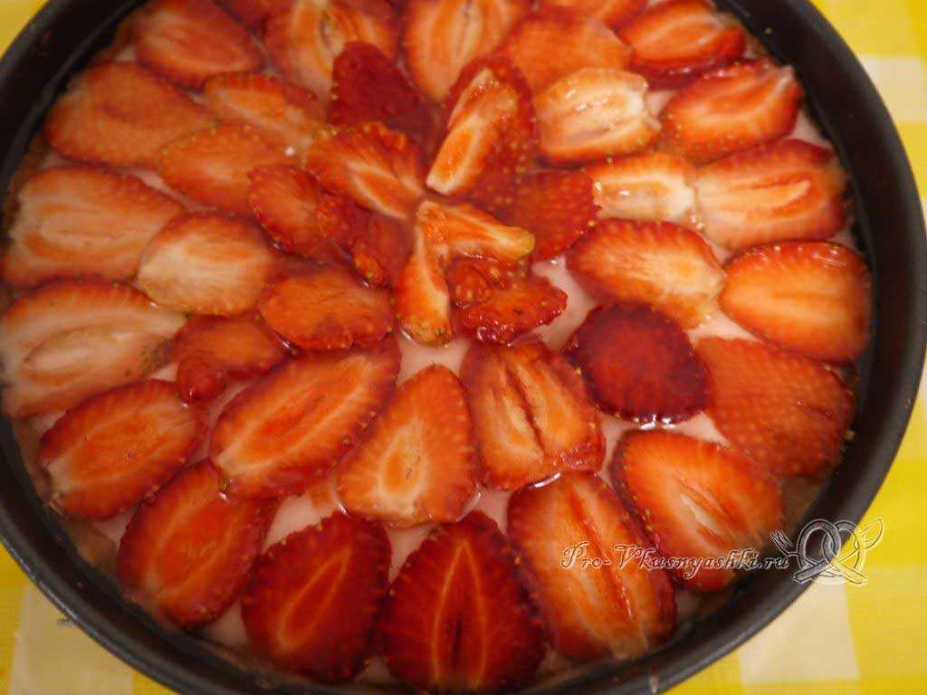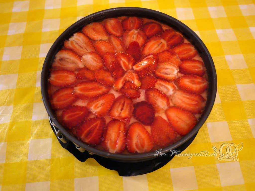 После того как клубника намертво пристала к творогу, можно выливать поверх чизкейка оставшуюся часть ягодного желе.
