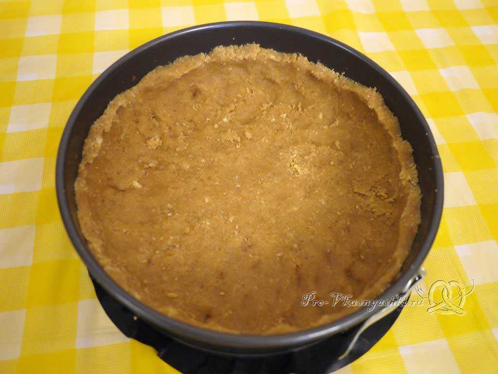 Перекладываем смесь в форму и равномерно уплотняем по дну. Убираем основу в холодильник.