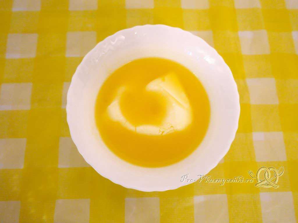 Сливочное масло растапливаем на водяной бане или в микроволновой печи. По второму варианту при мощности 800 Вт мне понадобилось 50 с.