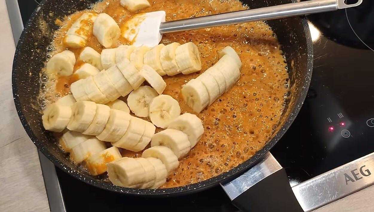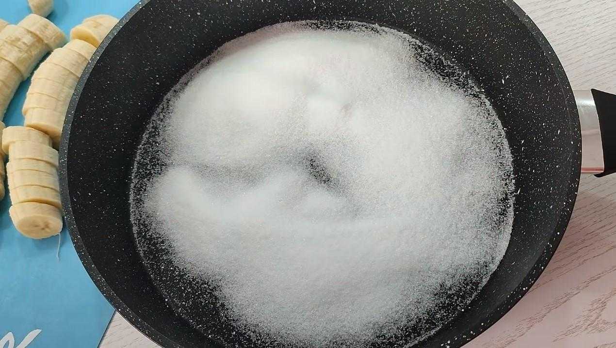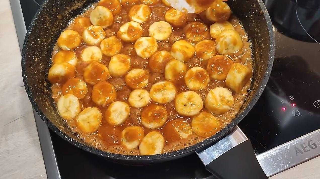 Далее высыпаем в карамель наши бананы и равномерно распределяем их.