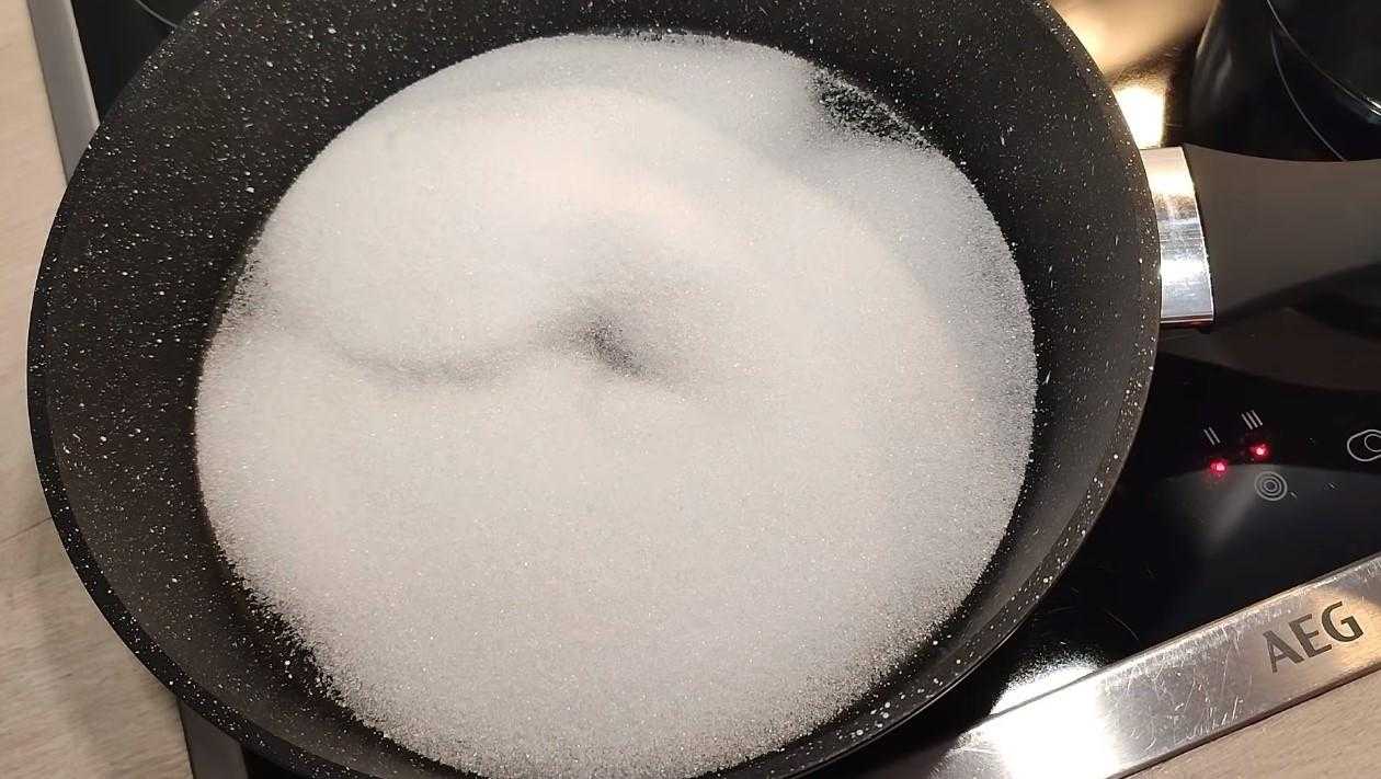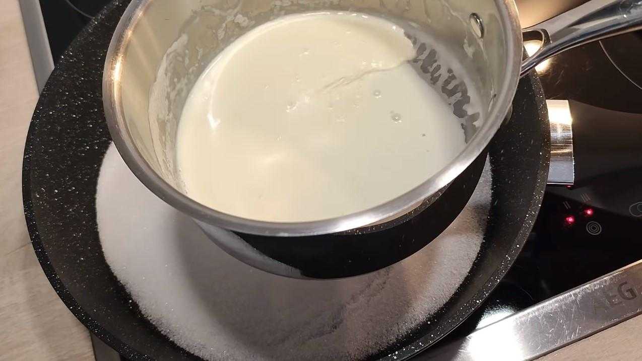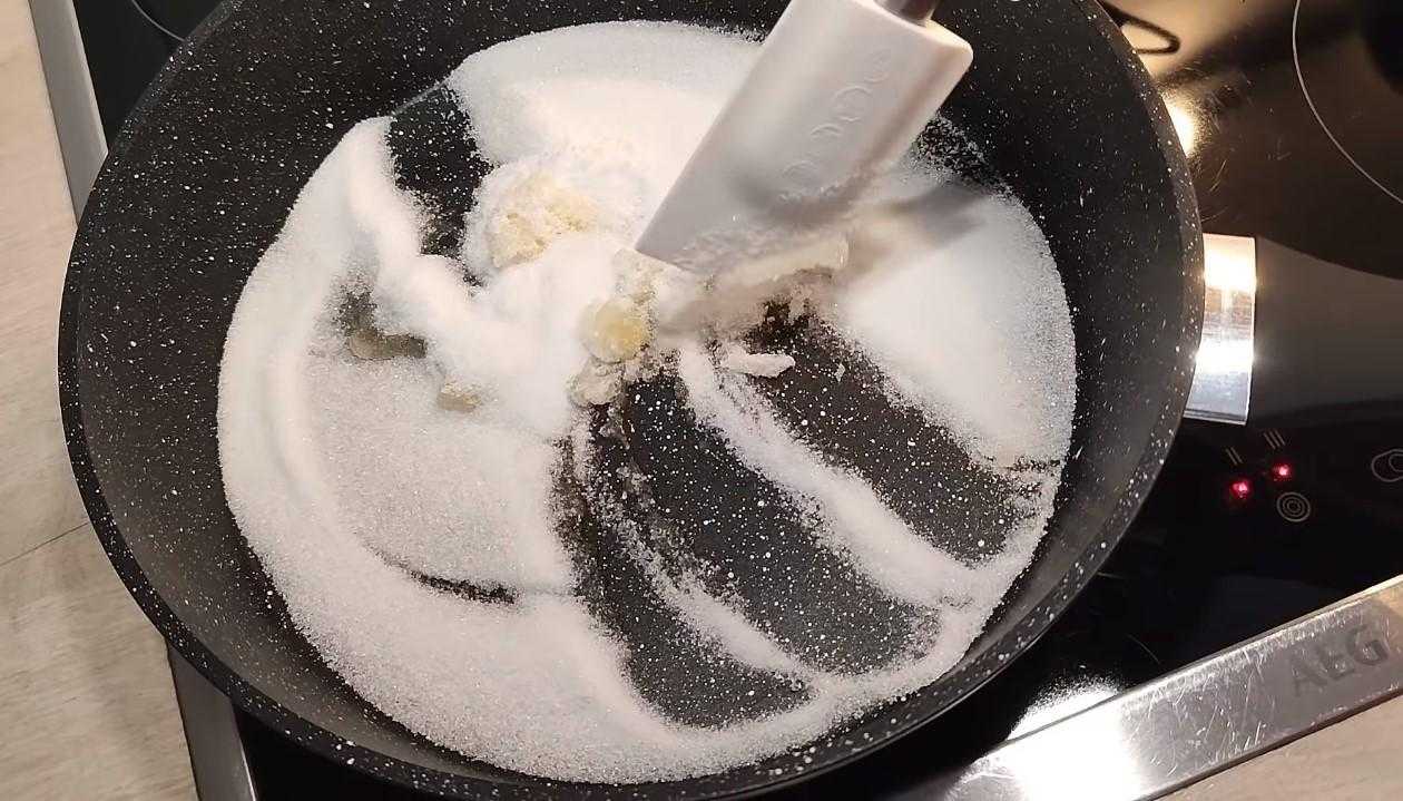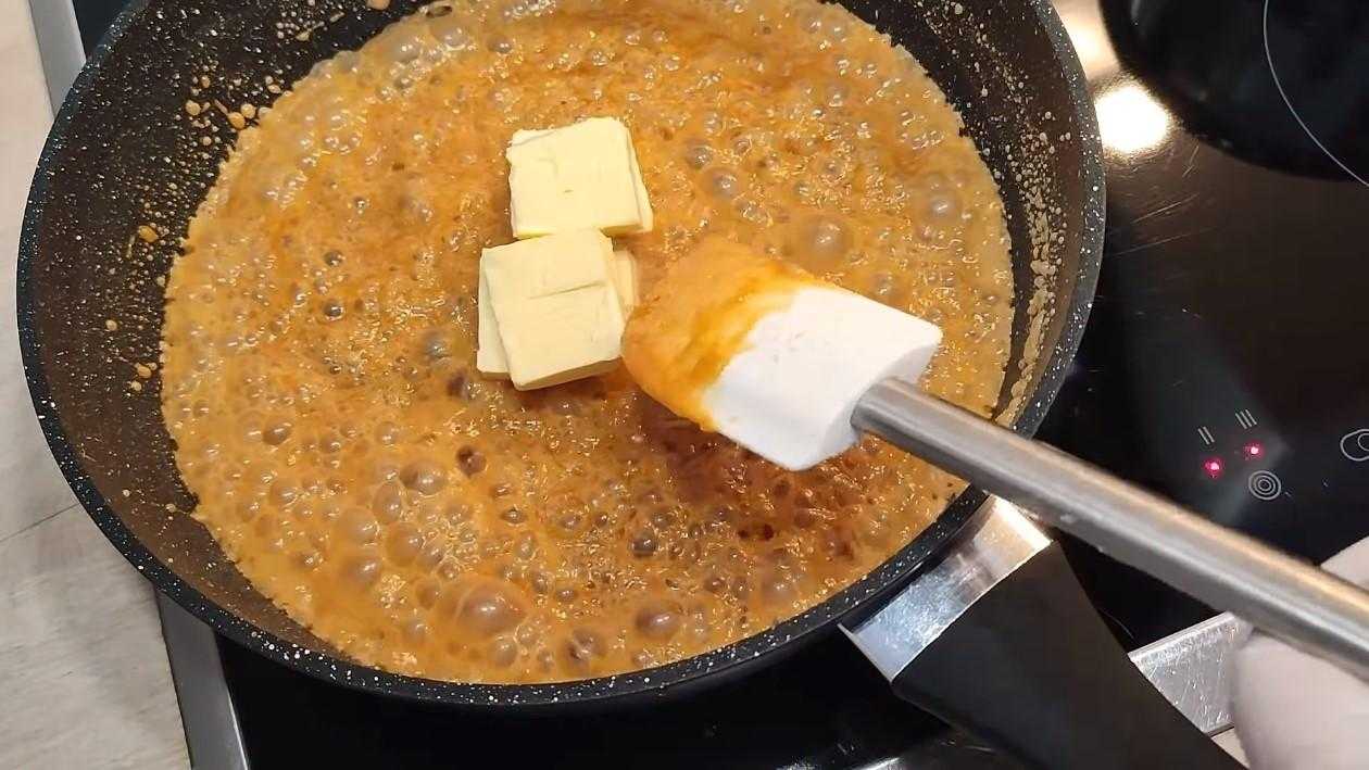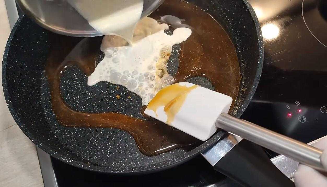 Когда в карамели полностью растворились все кусочки сахара, добавляем в нее сливки и все хорошо перемешиваем.