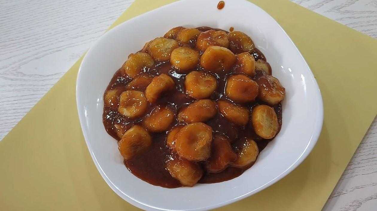 Рецепт рекомендует выбрать на этот раз спелые мягкие плоды. Сначала делаем глинтвейн. В кастрюльку наливаем стакан сладкого вина (кагора, мускателя). Если делать десерт для детей, алкоголь можно заменить прозрачным соком. Всыпаем двести пятьдесят граммов коричневого сахара. Кладем гвоздику, корицу и другие специи, которыми принято приправлять глинтвейн. Кастрюльку помещаем на средний огонь. Как только вино начало кипеть, уменьшаем пламя до минимума. Даем всем специям полностью раскрыться и передать свой аромат вину. Снимаем кастрюльку с огня и процеживаем ее содержимое через ситечко для чайной заварки. Ставим на очень маленький огонь чугунную сковороду. Распускаем в ней 4 столовых ложки сливочного масла. Четыре банана очищаем и нарезаем на круглые шайбочки толщиной не менее сантиметра. Жарим в масле до появления золотистой корочки. Затем вливаем глинтвейн. Доводим на небольшом огне (иначе спиртовой ингредиент испарится) до кипения. Карамелизованные бананы готовим около получаса. Подаем теплыми. Такой десерт можно украсить взбитыми сливками и тертой цедрой лимона.