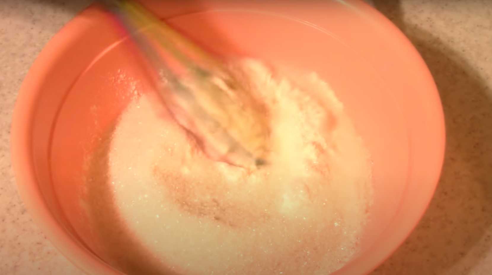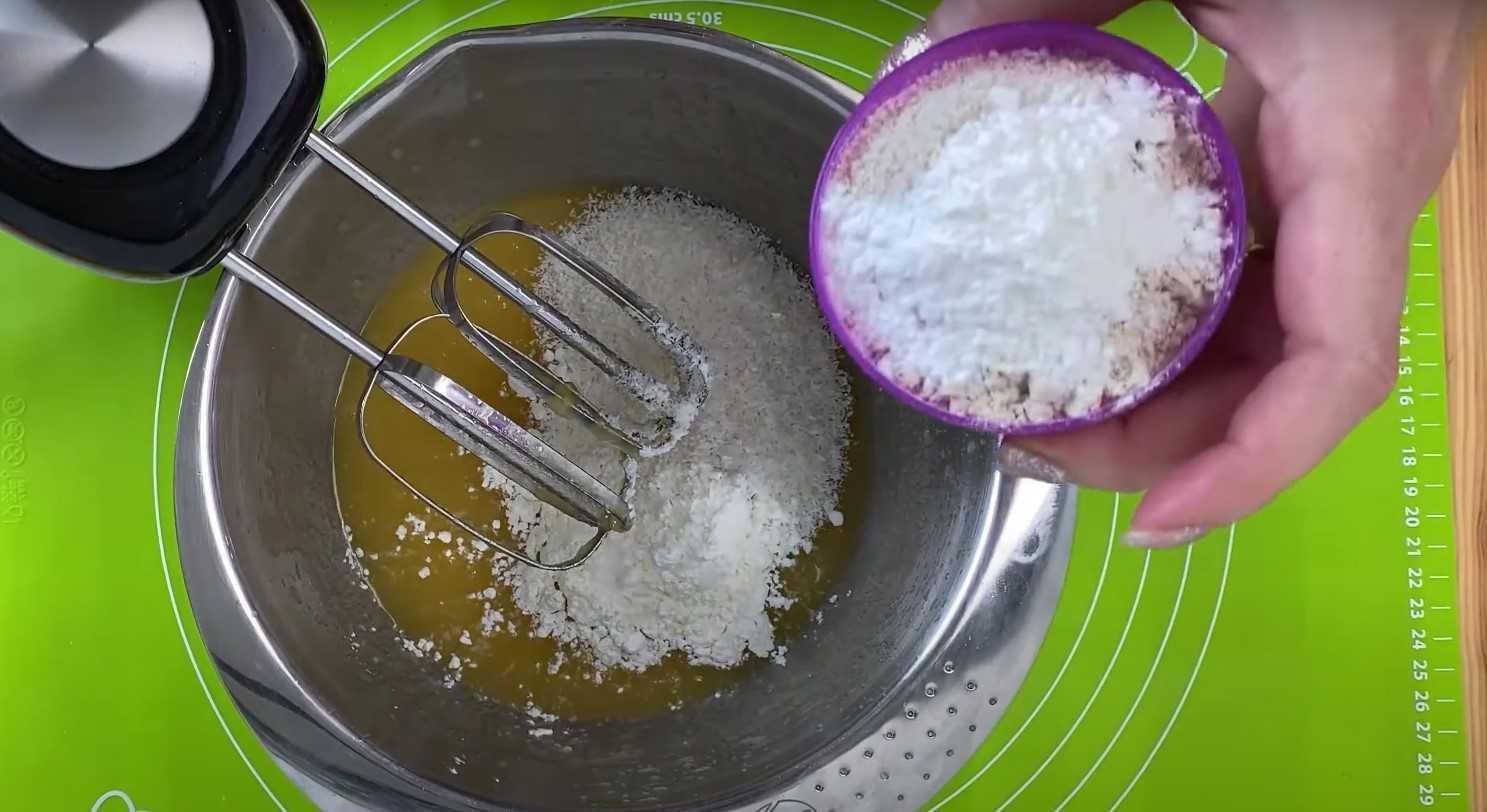 - Соедините сыпучие и жидкие субстанции. Полученное тесто взбейте с помощью миксера до однородной массы, чтобы не было комочков.