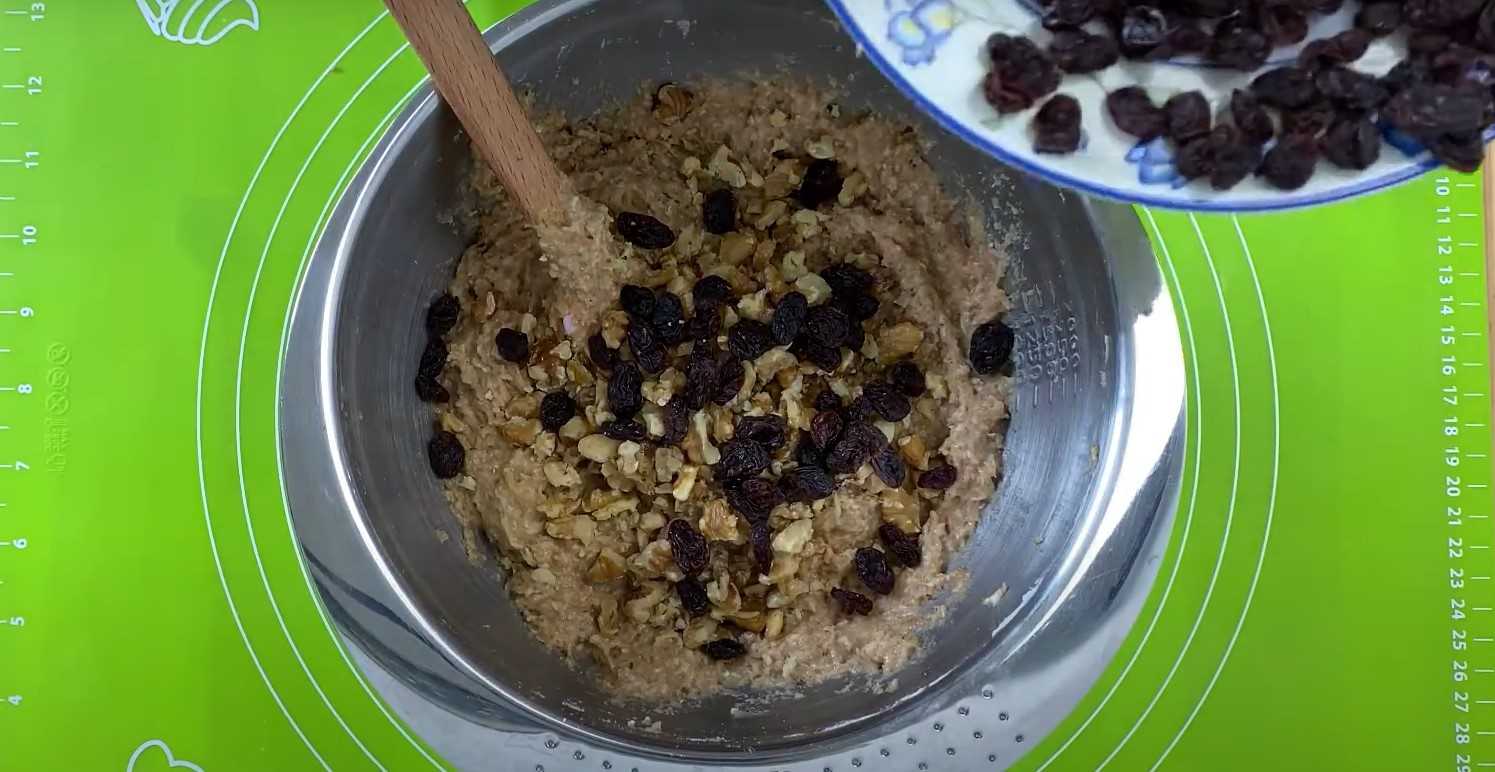 Добавляем в тесто орехи и изюм. Хорошо смешиваем.