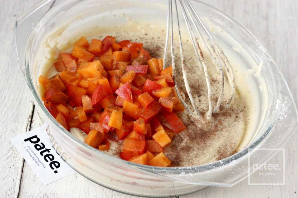 Хурму очистить от кожуры и натереть на крупной терке. Положить в тесто и аккуратно перемешать.