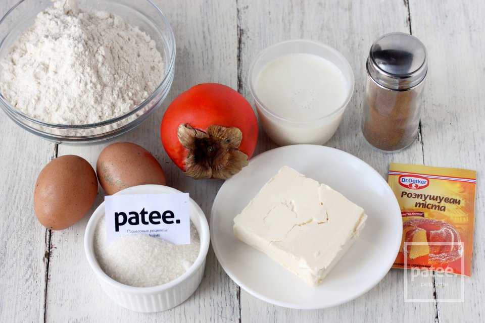 Для приготовления вкусных, мягких и ароматных кексов нам понадобятся следующие ингредиенты: куриные яйца, сахар, пшеничная мука, сливочное масло, молоко, корица молотая, хурма шарон, разрыхлитель.