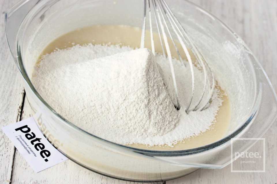 Пшеничную муку просеиваем с разрыхлителем, всыпаем в масляную смесь.