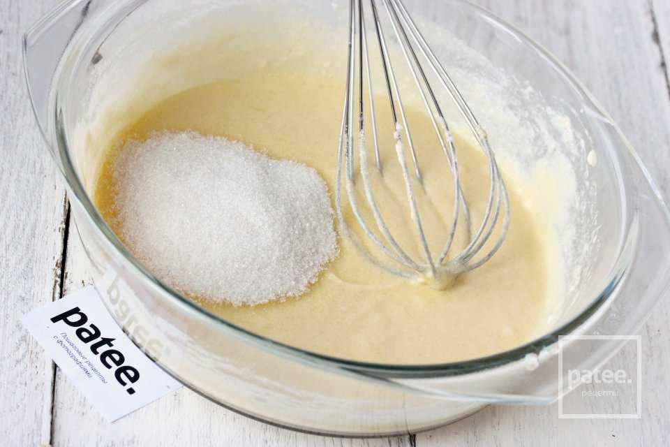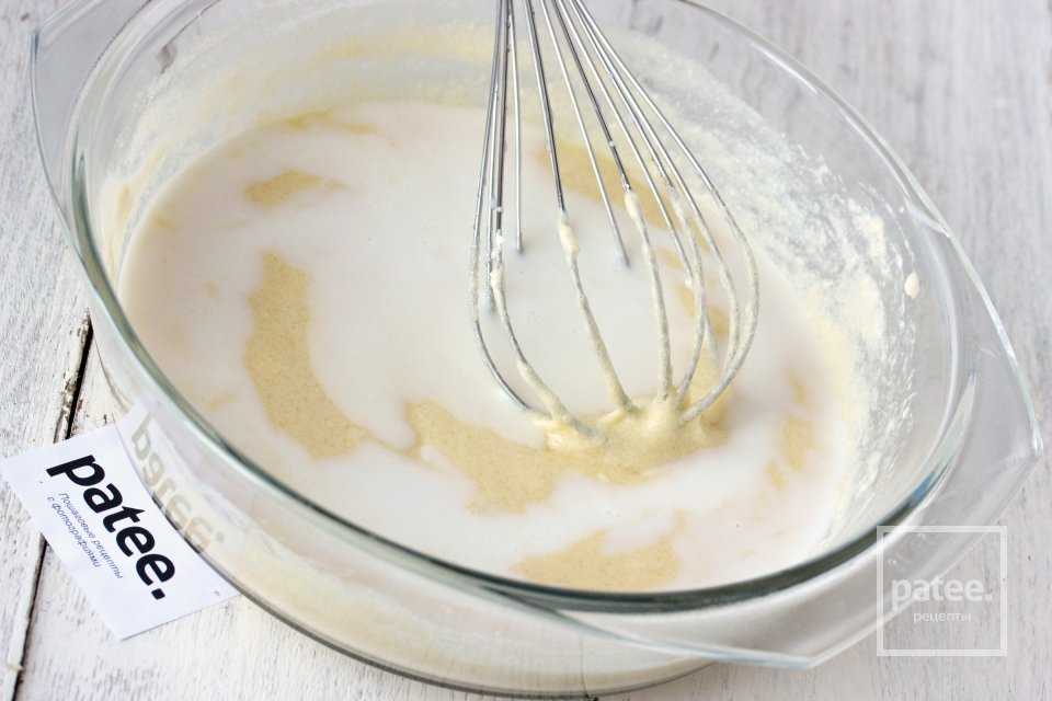 Вмешиваем сахар венчиком и вливаем молоко комнатной температуры. Перемешиваем. У нас получится однородная смесь.