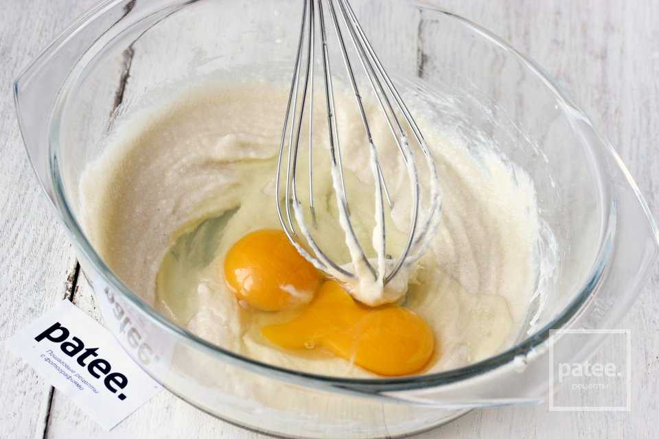 Вмешиваем яйца в масляную массу и всыпаем оставшийся сахар.