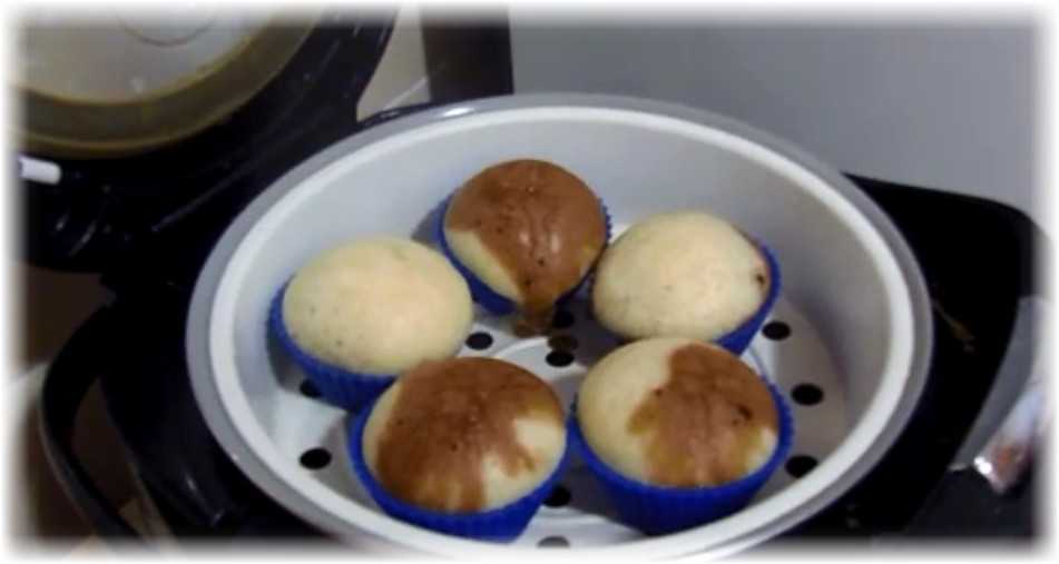 Отправляем наши заготовки в мультиварку. Выберем режим «варка на пару» и установим время 20 минут. Этого будет достаточно, чтобы кексы приготовились и стали пышными и воздушными. По истечении заданного времени мультиварка издаст звуковой сигнал, что свидетельствует о том что кексы готовы.
