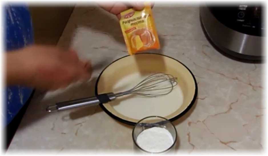 Следующим шагом будет добавление муки и разрыхлителя. Для более легкого приготовления 1 чайную ложку разрыхлителя можно добавить в стакан с мукой и тщательно размешать. А затем высыпаем эту муку в миску. Аккуратно и тщательно перемешиваем содержимое миски до состояния однородности. Масса должна получиться не слишком жидкой