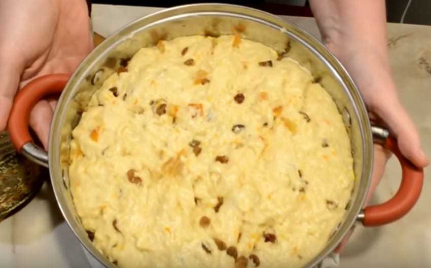 - Когда тесто поднялось и увеличилось в объемах аккуратно вмешиваем в него вымытый и высушенный изюм (вишню, орехи, шоколад и т. д.), следим, чтобы наполнитель равномерно распределился. Опять закрываем тесто пленкой и даем постоять около получаса.