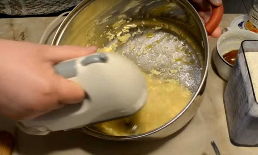 - Размягчив сливочное масло, растираем его с сахаром до однородной легкой массы. Затем туда добавляем яйца, не прекращая при этом взбивать. Делать это нужно порционно, вводя по одному и смешивая.
