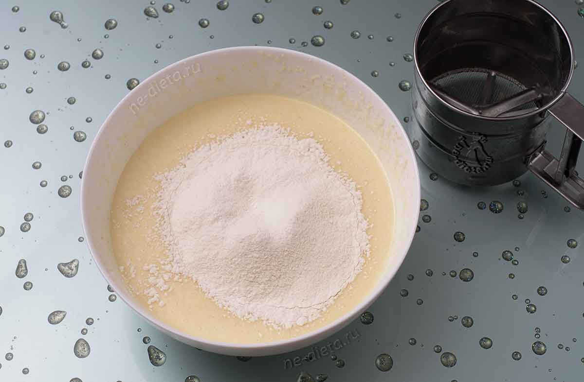 Всыпать в тесто муку, просеянную с разрыхлителем.