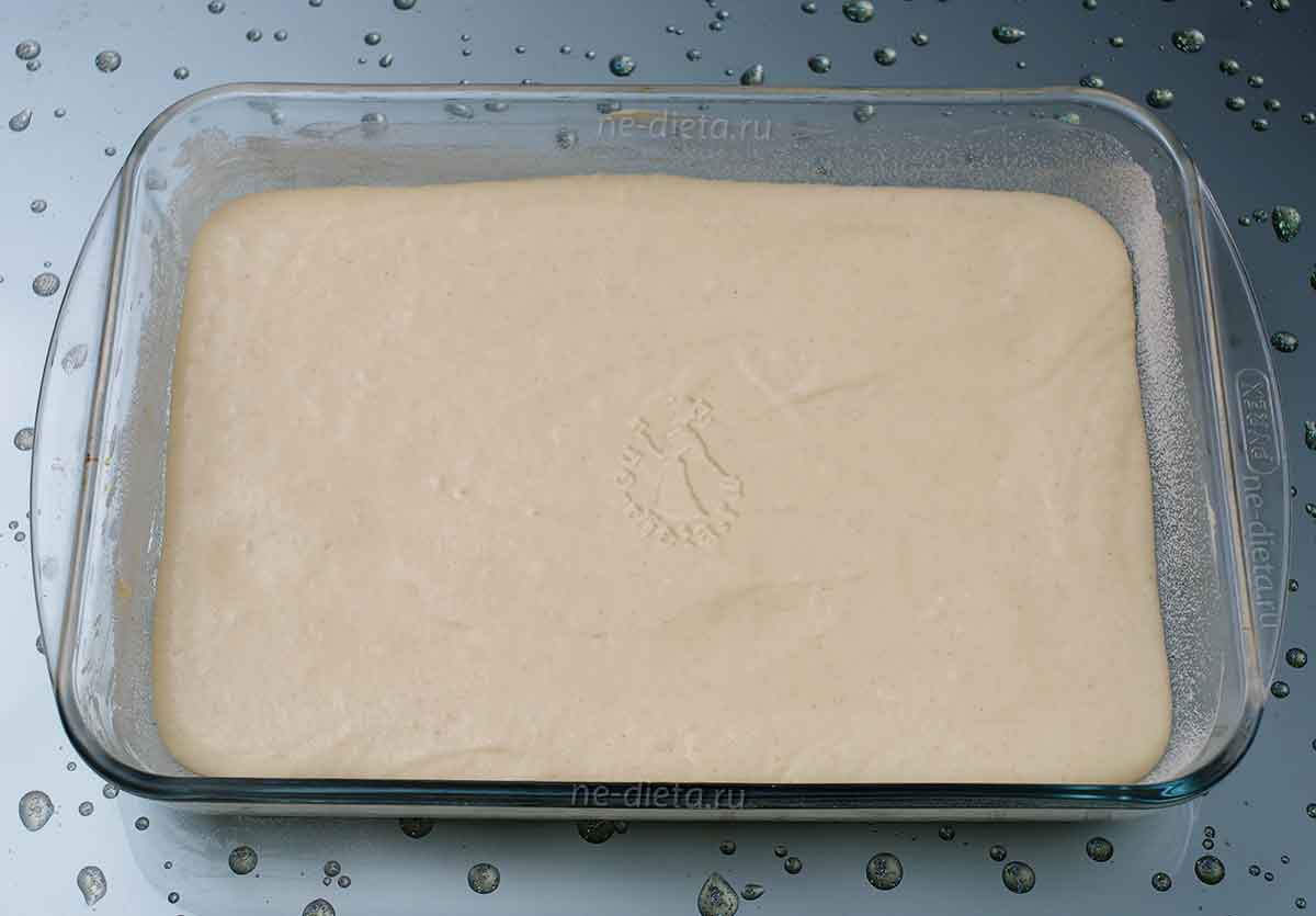 3. Подходящий противень смазываем маслом и перекладываем в него тесто.