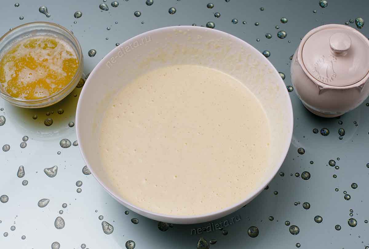 4. Сливочное масло растопите на водяной бане, немного остудите и добавьте в тесто.