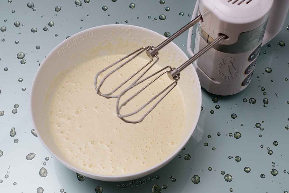 1. Первым делом взбивайте яйца с сахаром. Делайте это тщательно, до появления пены. Именно благодаря этому пирог получится более воздушный.