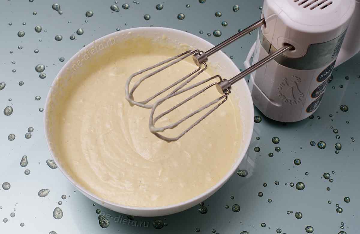 - Яйца взбиваем миксером до образования пышной пены, всыпаем постепенно сахар, разрыхлитель, ванилин, кладем сметану и тщательно перемешиваем. Далее всыпаем манку и муку и размешиваем до получения гладкого однородного теста.