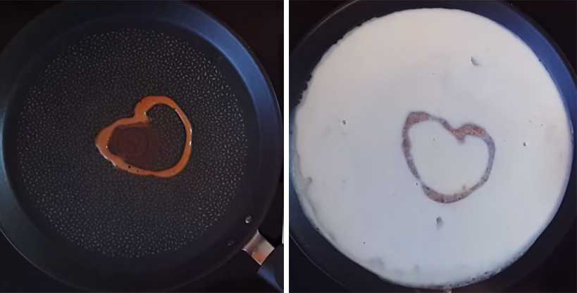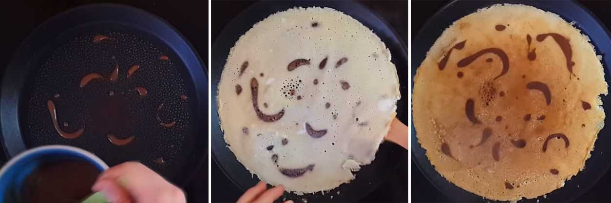 4. Хорошенько разогреваем сковороду, берем шоколадное тесто и рисуем им на поверхности сковороды рисунок, какой нам захочется. Ждем когда рисунок из теста схватится и тонким слоем наливаем сверху узора основное белое тесто.