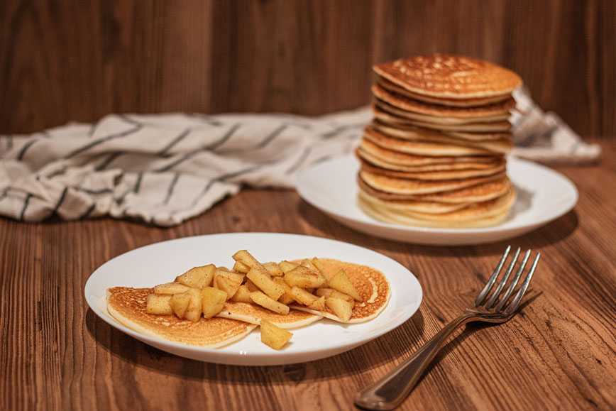 Панкейки по этому рецепту вышли нежные и воздушные. Мне нравится делать их не слишком сладкими — так получается приятный контраст кисловатого блинчика и сладкого яблочного соуса. Но если вы собираетесь есть их, например, со сметаной, в тесто можно добавить чуть больше сахара.