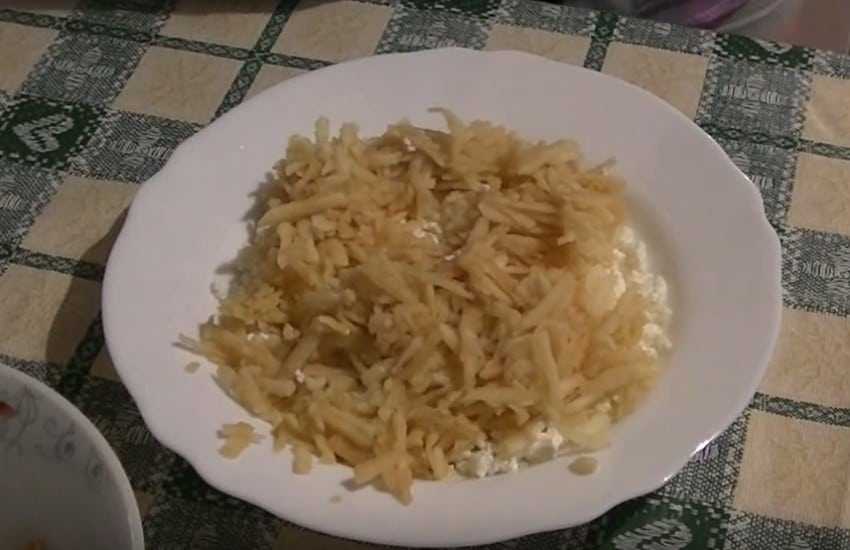- Натираем яйцо и сыр на крупной терке, разминаем компоненты вилкой.